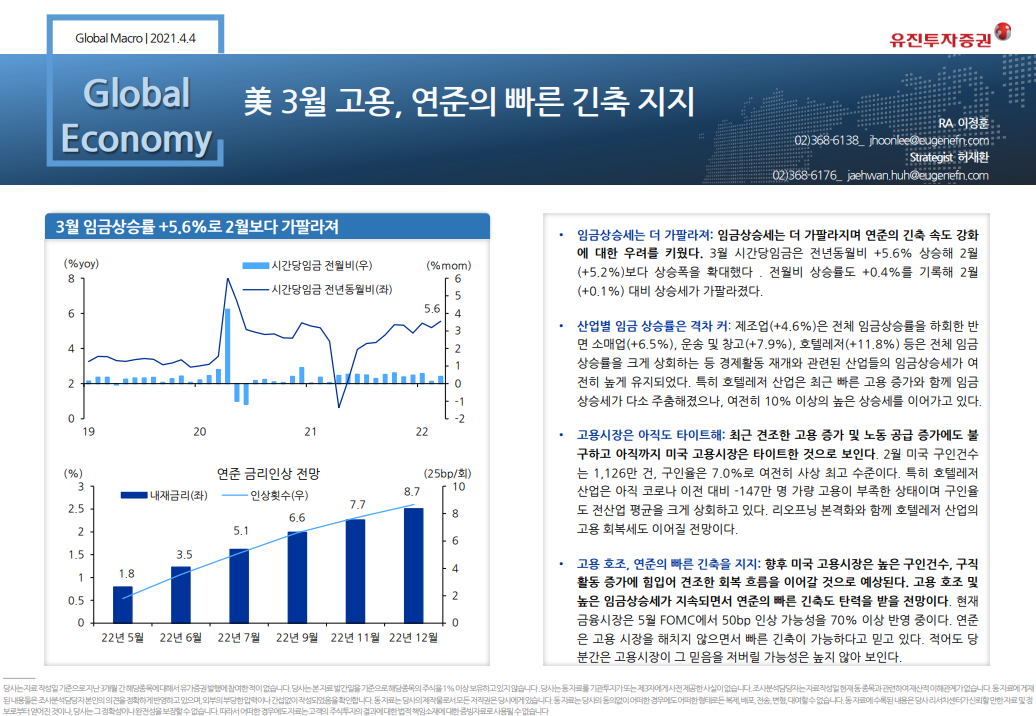 220404_美 3월 고용, 연준의 빠른 긴축 지지: 실업률 하락, 임금 상승으로 총수요 증가 요인, 이로써 연준의 긴축 드라이브가 강해질 가능성 高