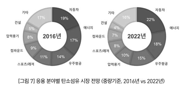 - 세계 탄소섬유 시장에서 중량 기준 약 15%를 차지하고 있는 우주·항공 분야는 금액 기준으로는 약 60%의 높은 점유율. 이는 우주·항공 분야 탄소섬유 시장의 고부가가치적 특성을 보여주는 증거