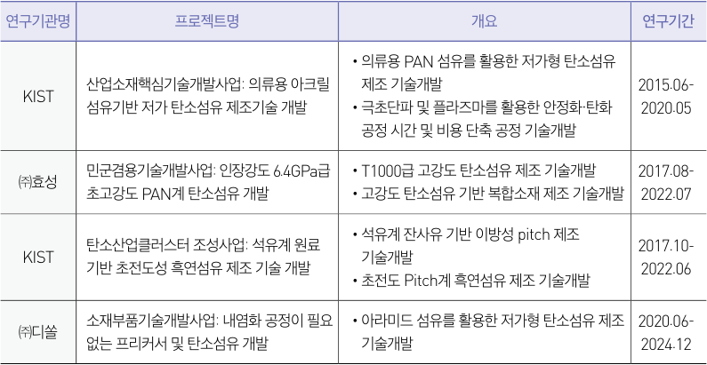 *탄소섬유 사업에 적극적인 행보를 보이는 효성은 전라북도 전주시와 함께 탄소 클러스터 조성에 적극적으로 참여하고 있고, 지난 정부의 창조혁신센터에 참여해 탄소섬유관련 스타트업 발굴을 위한 기술 및 재정 지원에 적극 참여 중임. 참고로 효성은 2011 년 탄소섬유 개발에 성공하였으며, 2013 년 말에 고성능, 탄소섬유 “탄섬(TANSOME )"을 선보였음.