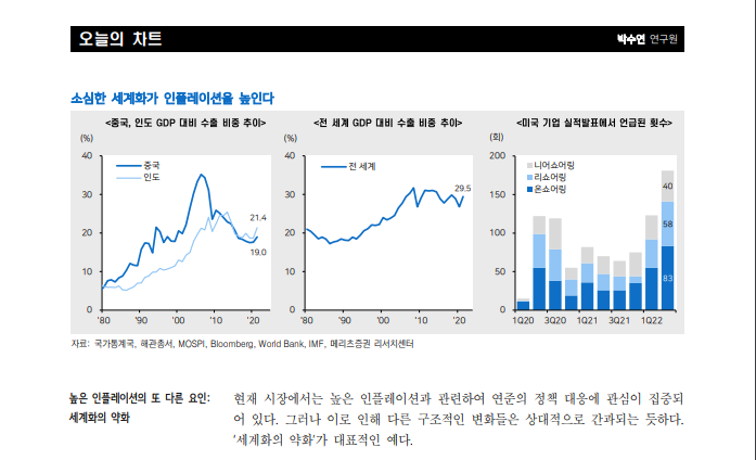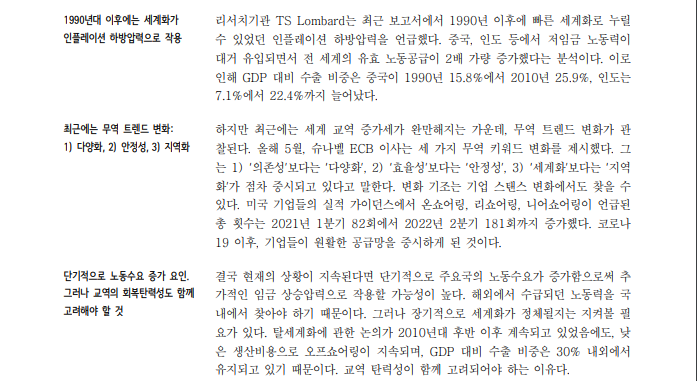 - 디플레이션의 원인 분석(https://valuefactory.tistory.com/1034?category=765127)에 따르면, 국가 간 수출입은 장래 장기적인 디플레가 우세하다고 보는 중요한 변수중 하나였다. 그러나, 최근 G2간의 세력 다툼 및 지역 간 불화(우러전쟁)에 따라 선진국의 물가를 지탱하던 수출입률 이라는 변수가 예측과 다르게 흘러가면서, 장기적인 디플레이션 가능성도 낮아지고 있다.