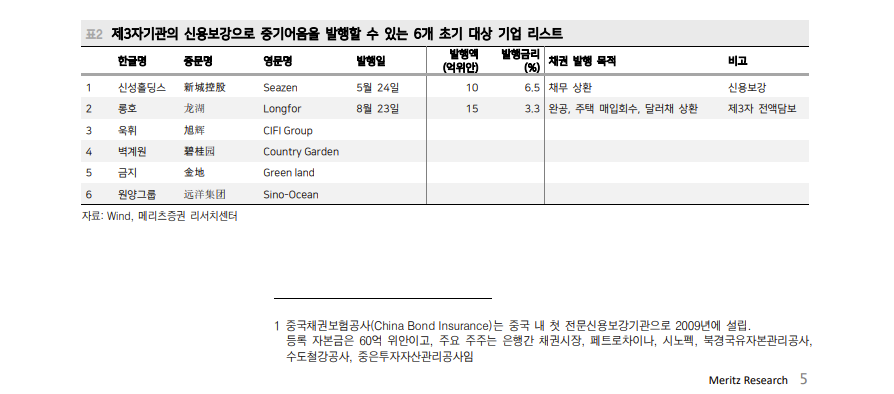 - 은행간 채권거래위원회는 중국 채권보험공사(China Bond Insurance)1의 100% 신용보강 하에 일부 민영 디벨로퍼들의 중기어음 발행 허용