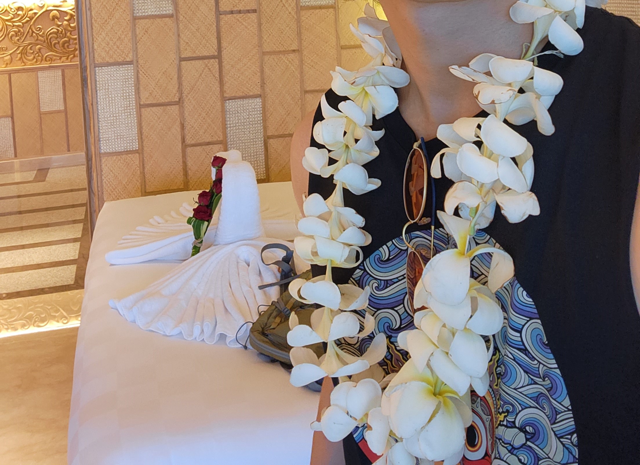 처음 입장하시면 목에 뭘 둘러줍니다. 꽃으로된 화환 같은 건데요. 인도네시아의 상징과도 같은 Frangipani 꽃으로된 화환을 목에 얹어줍니다. Frangipani 꽃은 발리에 있던 내내 어디든 피어있었고, 그 때문에 어디서든 그 은은한 향을 느낄 수 있어서 너무 좋았습니다.