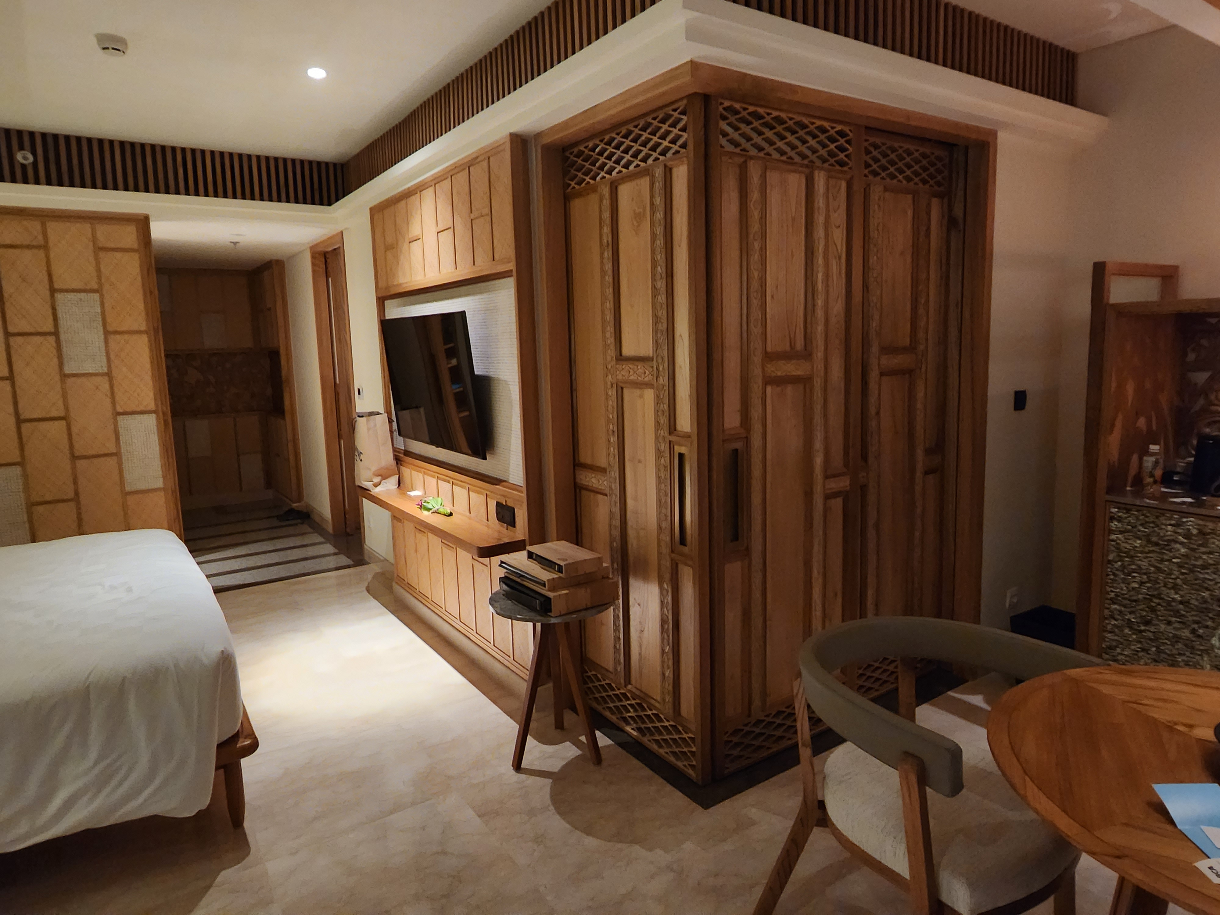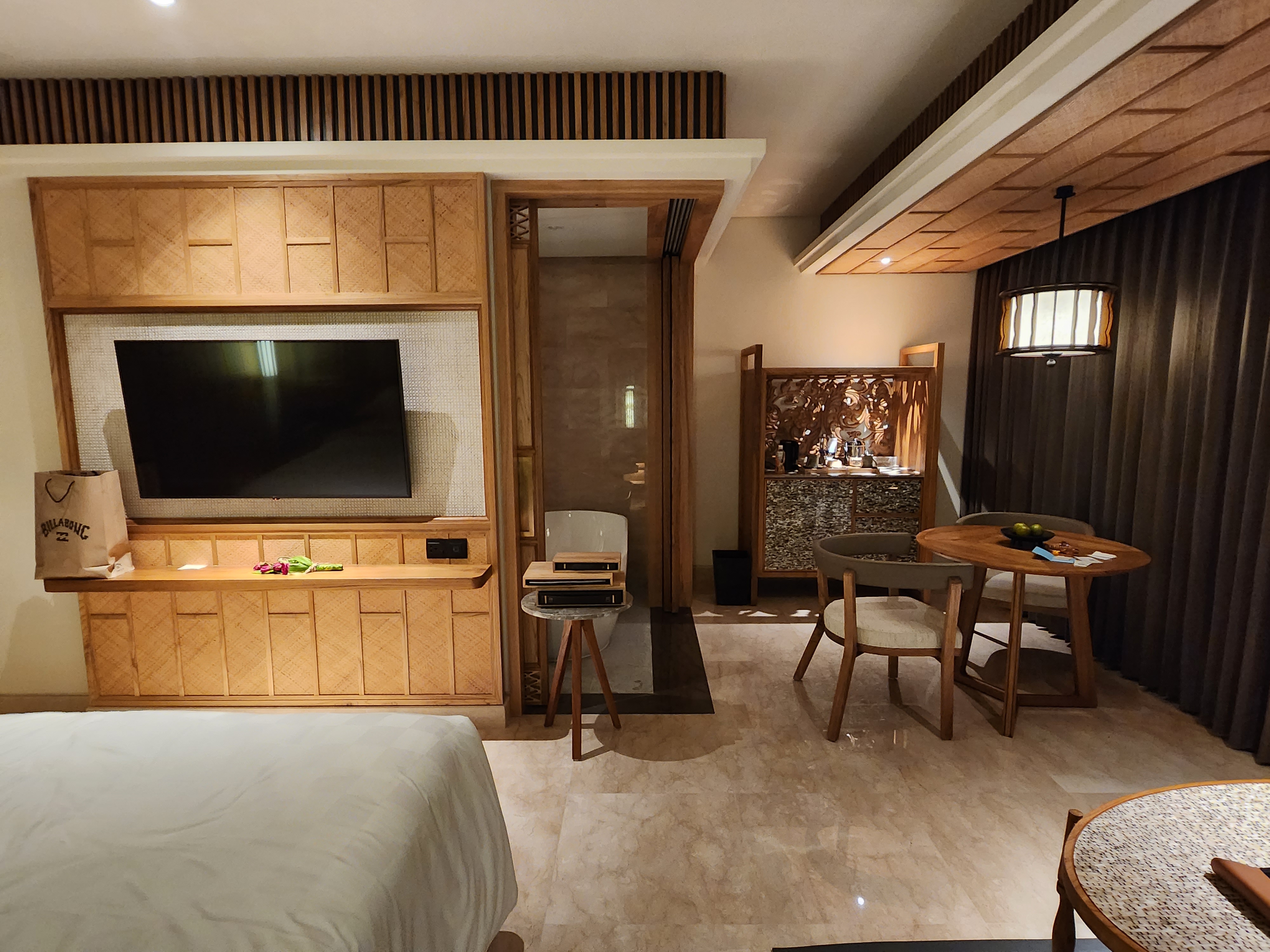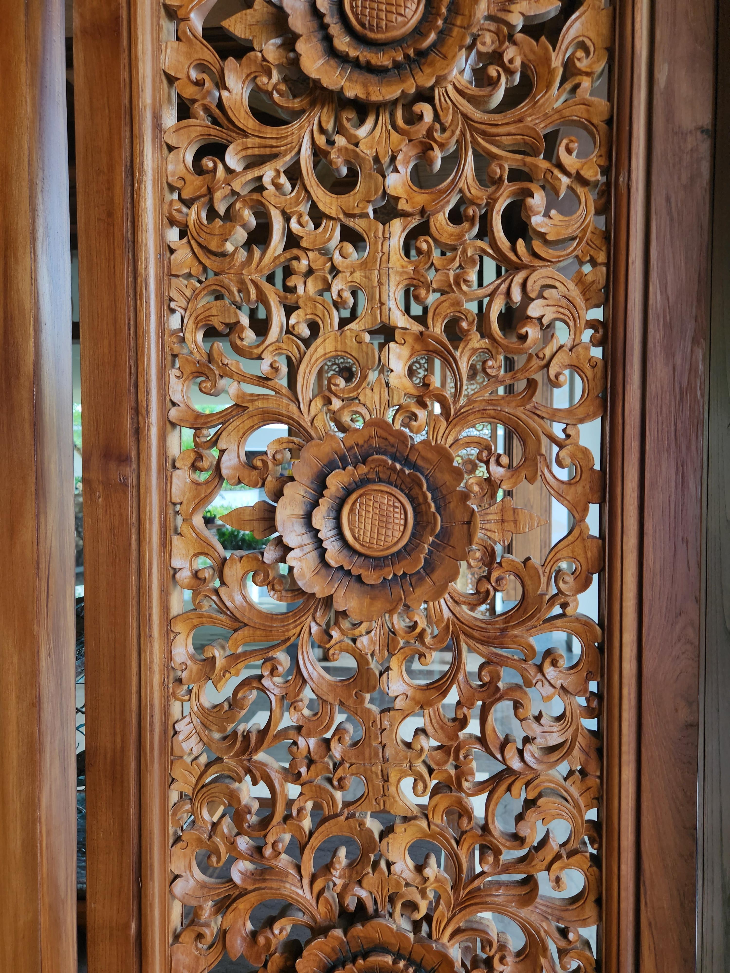 처음 입장했을 때 묵직한 느낌이 나는 나무위에 꽃을 새겨넣은 장식물들이 로비를 비롯 객실에도 배치되어 있습니다. 발리에서 많이나는 Teak 나무를 활용해 발리 전통 문양을 새긴거라고 하는데 독특하더군요.