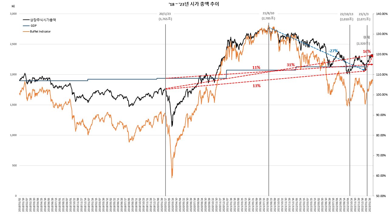 - '19년 → '23년 2월 8일 間 GDP는 11% 증가한 반면, 시가총액은 31% 증가 하여 주식 시장 과대 평가 현상