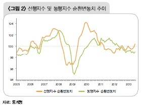 일반적으로 선행지수 순환변동치가 100 이상이면 장기추세보다 더 성장하고, 100 이하면 추세보다 낮게 성장할것이라고 예측한다. 또한 동행지수 순환변동치가 100 이상이면 경기가 호황이고 100 미만이면 경기가 불황이라고 여긴다. <그림 2>는 선행 및 동행 지수 순환변동치를 한눈에 보여준다. 선행지수 순환변동치는 2007년 말부터 급감하다 2009년 이후 상승세를 보였다. 동행지수 순환변동치도 약간의 시간차를 두고 비슷한 양상을 보였다. 2011년 4월 이후부터 최근까지 100을 넘는 경우가 드물었던 선행지수 순환변동치는 2013년 6월 건설수주액·코스피는 감소했으나 기계류내수출하지수·구인구직비율 등이 증가해 전월 대비 0.5p 상승한 100.4를 기록했다. 동행지수 순환변동치는 2012년 5월 이후 100 미만을 지속하고 있으며, 2013년 6월 건설기성액·비농립어업취업자수 등이 증가해 전월 대비 0.2p 상승한 99.0을 보였다