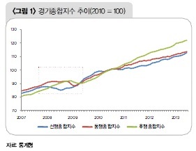 <그림 1>은 2007년 이후의 선행·동행·후행 종합지수를 보여준다. 각 종합지수는 전체적으로 증가추세를 보이고 있지만, 세계 금융위기가 있었던 2008년에 눈에 띄는 변화가 있었다. 우선 선행종합지수가 하락했다. 이어서 동행종합지수와 후행종합지수가 떨어졌다. 이처럼 경기종합지수를 살펴보면 과거와 현재 그리고 앞으로의 경기변동을 살펴볼 수 있다.