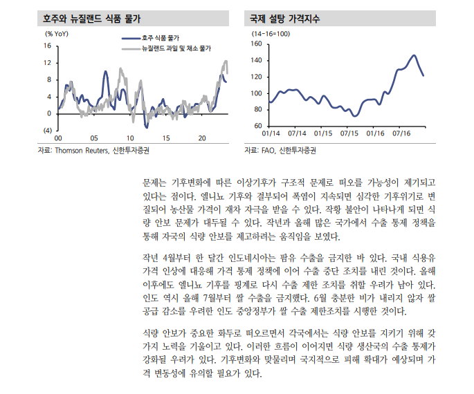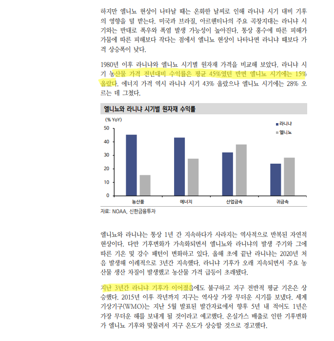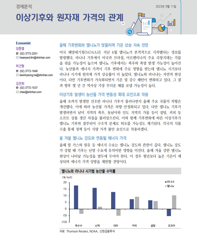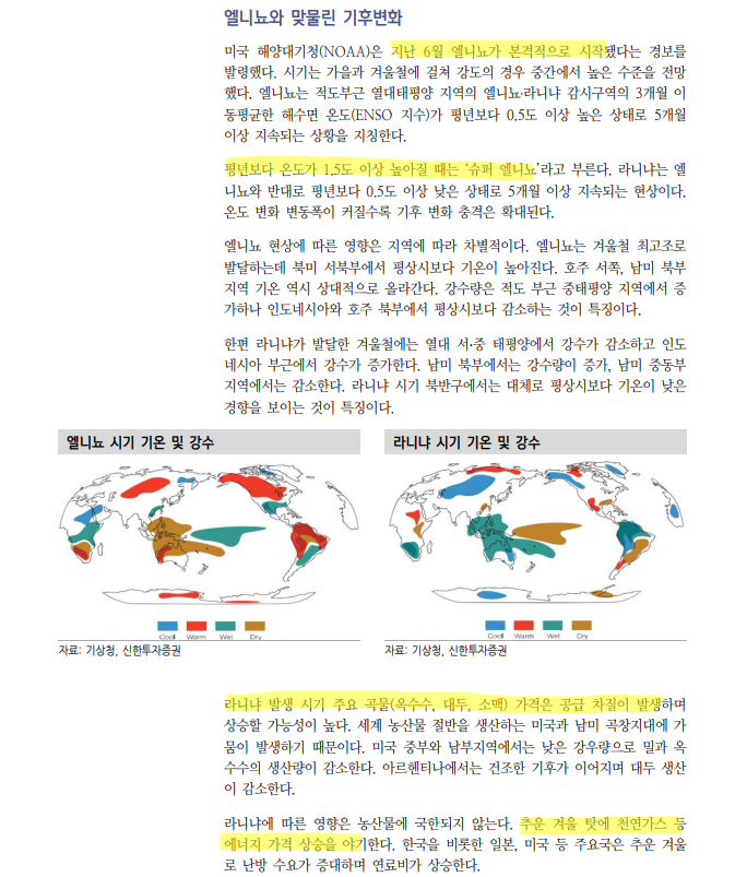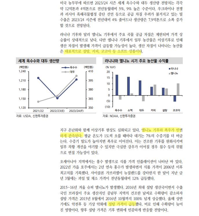 230911_이상기후와 원자재 가격의 관계: 향후 3년 엘리뇨, 설탕코코아등 농작물 생산량 감소, 온도 상승으로 인한 에너지 수요 감소할 것