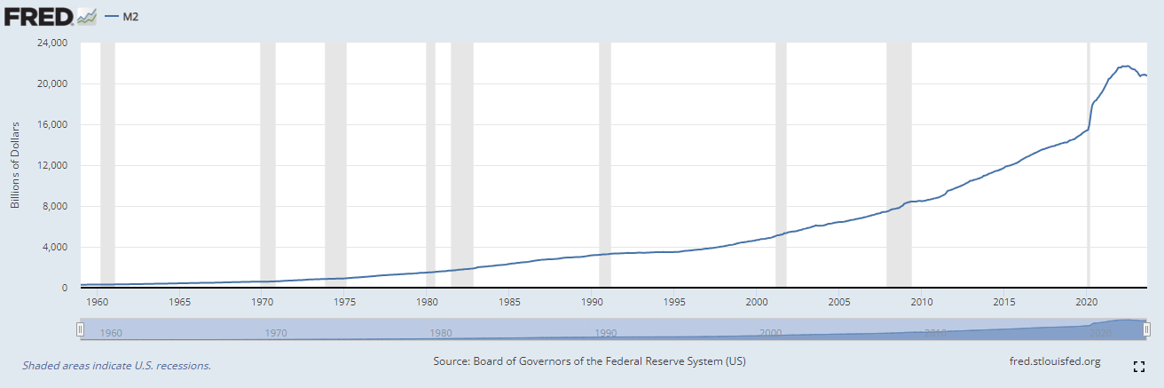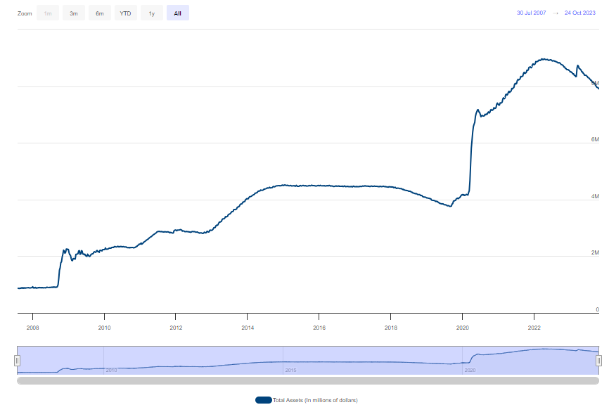 - 화폐량이 감소: 금리 인상 및 연준의 국채 매입에 따른 화폐량 (↓) [A. 연준 대차대조표 트렌드, B. 미국 M2 트렌드]