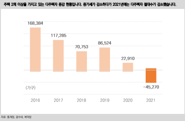 - 기존 다주택자는 국내 313가구가 존재하며, 다주택자 증가율은 점차 감소하여 '21년에는 절대수조차 -45,270 감소