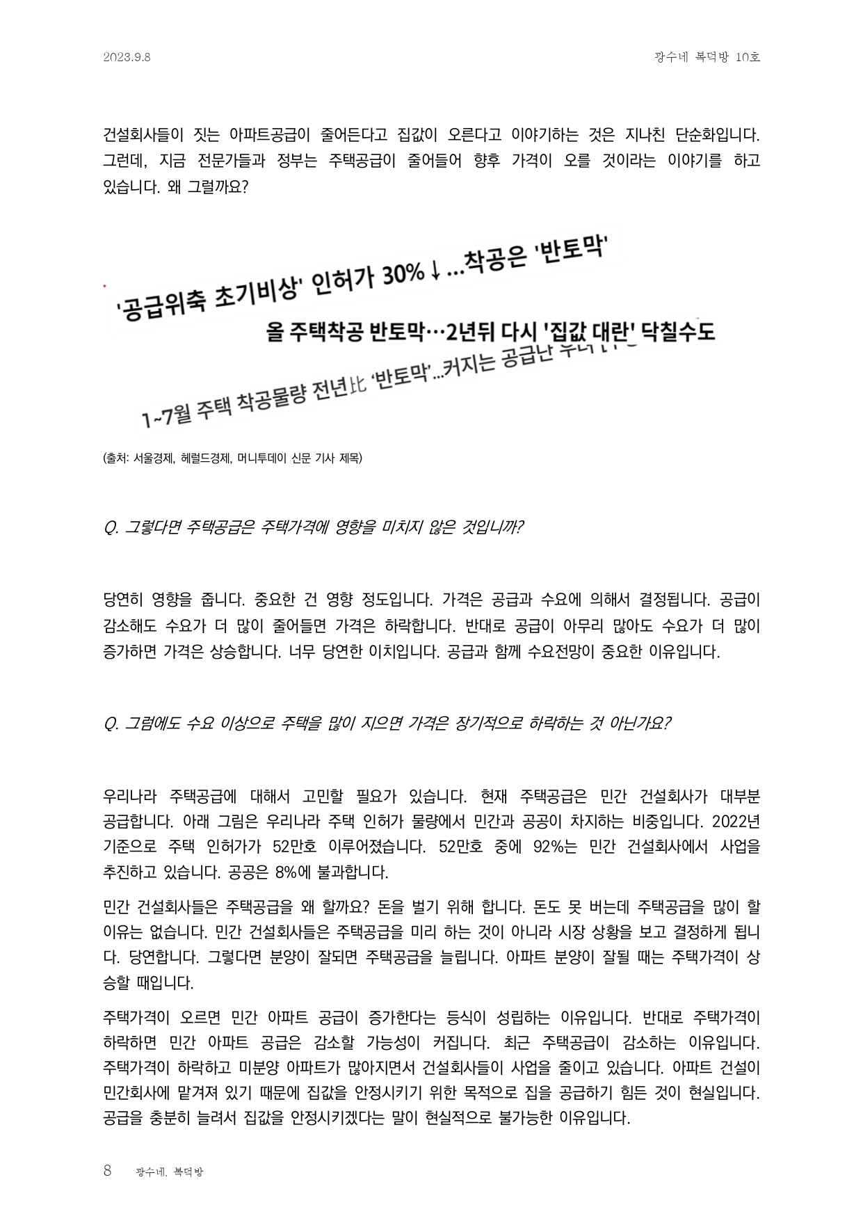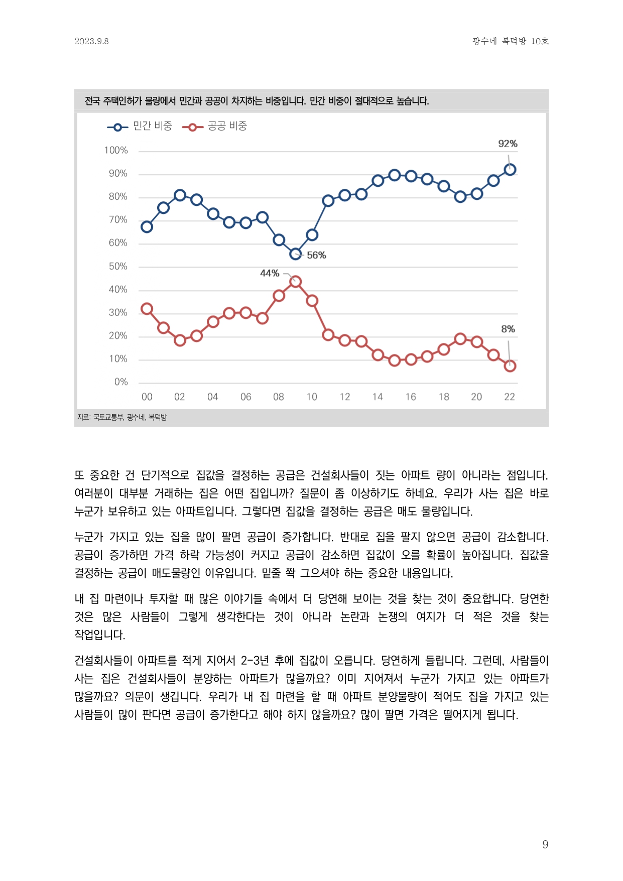 - 신규 공급은 민간업자가 '22년 92%로, 민간업자는 부동산이 높은 가격에 팔리지 않으면 건설하지 않으므로 충분한 공급으로 이어질 수 없음