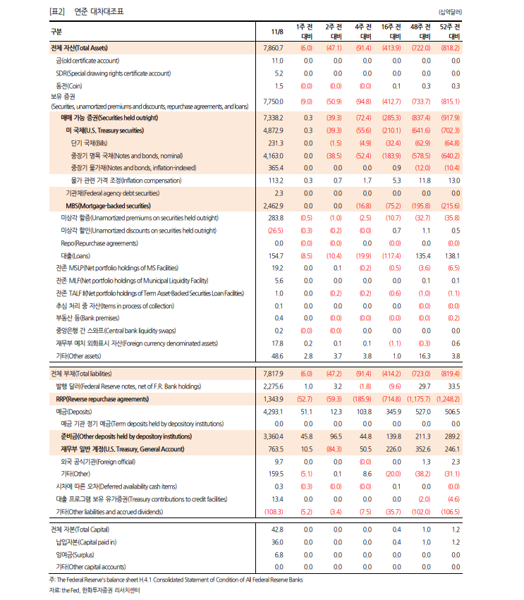 231116_연준 대차대조표 뜯어보기: RRP 감소, 국채 MBS 등 자산 감소하며 QT 지속 실행 중