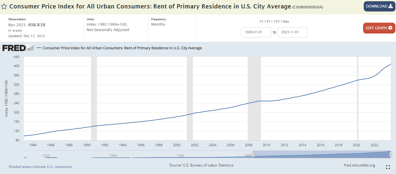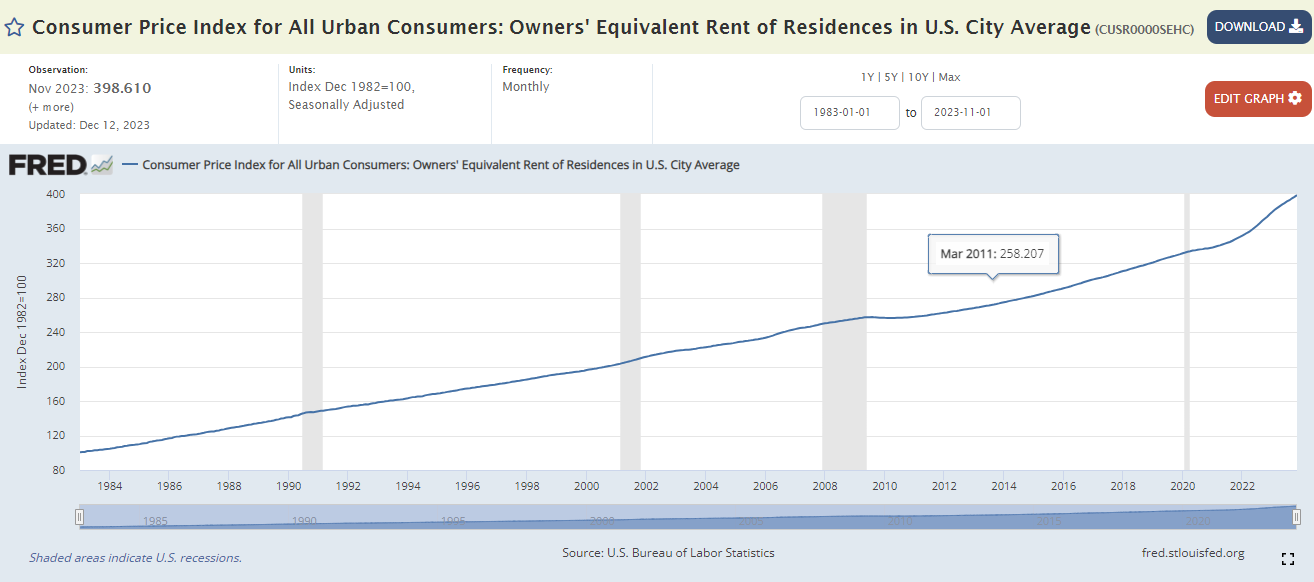 Owners'equivalent rent of residences(OER) 는 현재 소유한 주택을 임대 부동산으로 대체하기 위해 지불해야 하는 임대료 금액입니다 . 이 가치는 임대 등가물이라고도 합니다. 즉, OER은 부동산을 소유하는 데 드는 월 비용(예: 모기지, 세금 등)에 해당하는 월 임대료 금액을 계산합니다. (https://www.investopedia.com/terms/o/owners-equivalent-rent.asp)