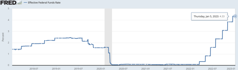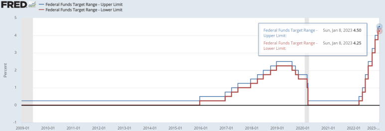 연준에서는 1년에 8차례 정기회의를 개최하여 기준금리를 결정한다. 미국 내외 다양한 경제 상황과 지표들을 고려하여 "기준금리는 X.XX% ~ X.XX% 로 하겠습니다 땅땅땅" 하고 공표하게 된다. 최근 연준에서는 급격한 금리인상을 단행해 미국 기준금리를 15년만에 최고치인 4.25% ~ 4.5% 로 설정하였다.