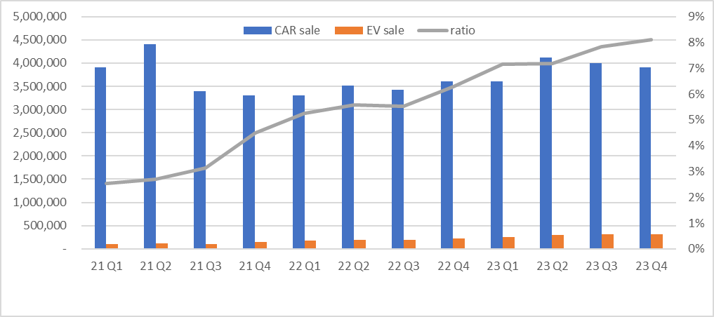 - 신규 구매자 中 전기차 구매비율은 '23년 4분기 8.12% 수준으로 지속 상승 중이나 최근 상승세 기울기 감소