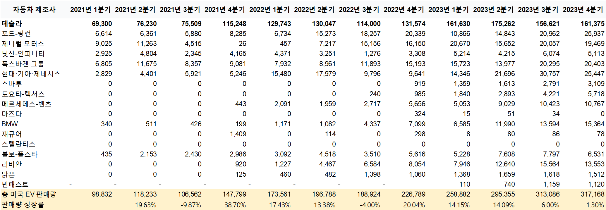 미국 전기차 시장 주요 경쟁사 시장 쉐어 및 실적