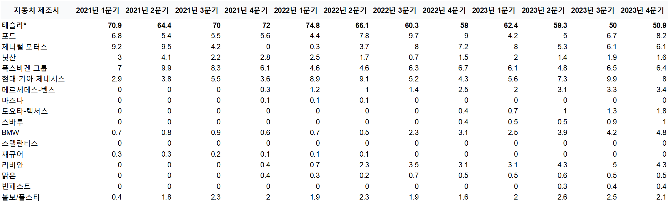 - 경쟁격화에 따라 테슬라의 점유율 '21년 1분기 70.9 % > '23년 4분기 50.9%까지 하락