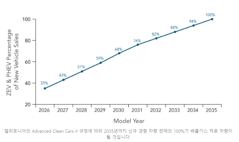 - 캘리포니아주는 다른 어떤 주보다 훨씬 앞서 2022년 8월에 자동차 소유자가 ICE에서 무배출 차량(ZEV)으로 전환하도록 강제하는 기본 규칙을 설정했습니다. 이 규정은 2026년에 차량 판매의 35%를 배출가스 제로로 규정하고 있으며, 2035년에는 100%로 증가합니다. (링크)