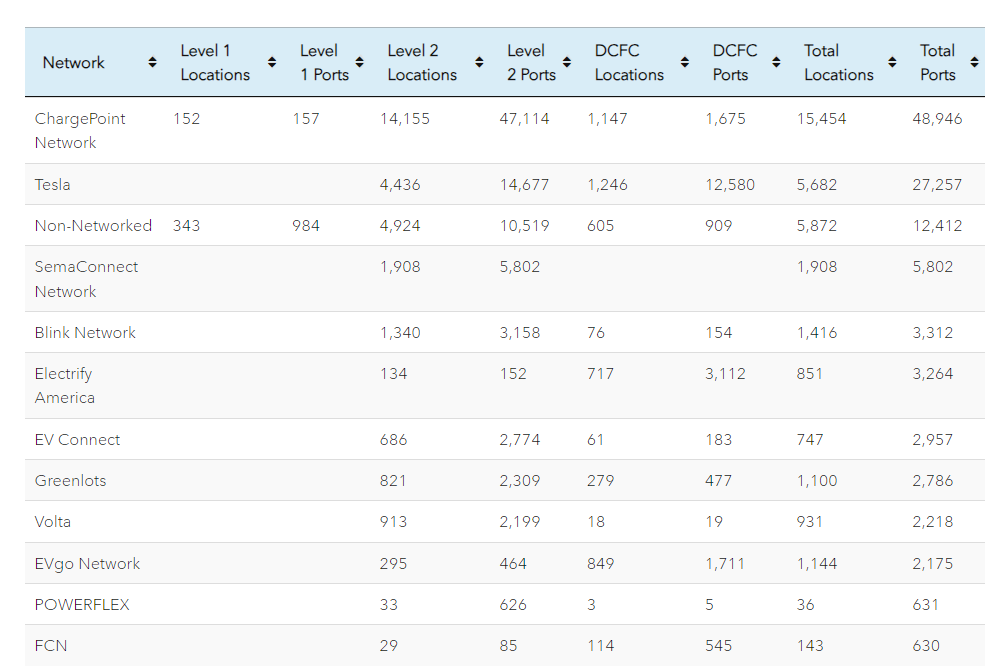 - 사용 가능한 충전 포트의 대부분은 미국 전체 공공 충전 포트의 76%를 차지하는 레벨 2 충전기입니다. DC 고속 충전기는 약 23%를 차지하며, 이러한 고속 충전기의 대부분(63%)은 Tesla 네트워크에 있으므로 Tesla 운전자만 접근할 수 있습니다.