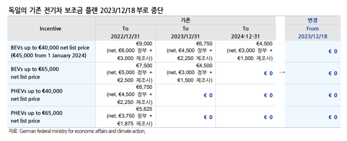 - 독일 정부가 배터리 전기차에 대해 지급해 오던 환경 보너스 3,000~4,500유로 지급을 2023년 12월 17일부로 중단한다고 발표했다. 이는 독일 헌법재판소가 지난 11월 기존 600억 유로의 기후변화 대책기금이 위헌으로 판단해 재원 확보가 어려워졌기 때문이라고 밝혔다. (링크)