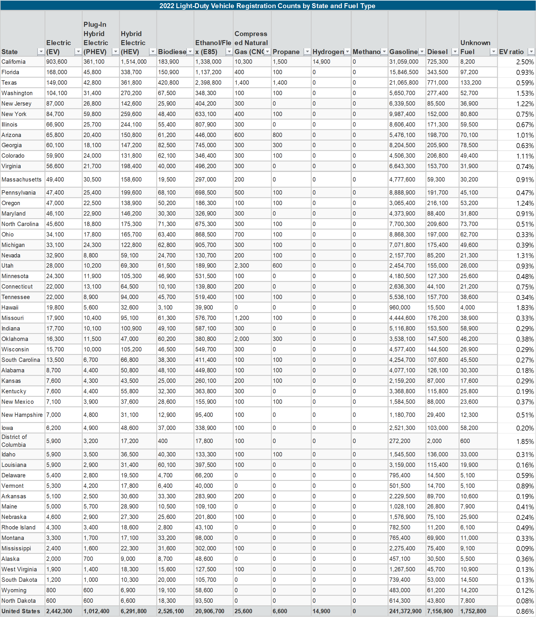 - 에너지국 조사에 따르면, '22년 미국 전체 전기차 대수는 2,442,300대이며, 그 중 캘리포니아의 전기차 대수 903,600대로 1위