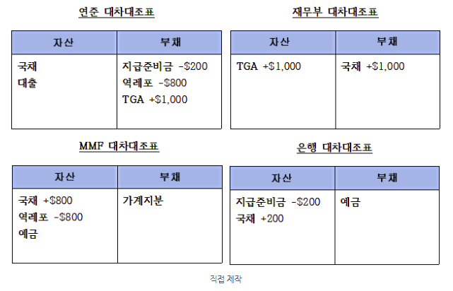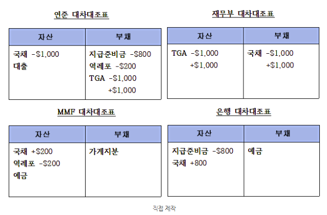 은행 대차대조표 규모는 동일하지만 자산 구성이 달라집니다(국채 증가, 지급준비금 감소). MMF도 대차대조표 규모가 동일하지만 자산 구성이 달라집니다(국채 증가, 역레포 감소)