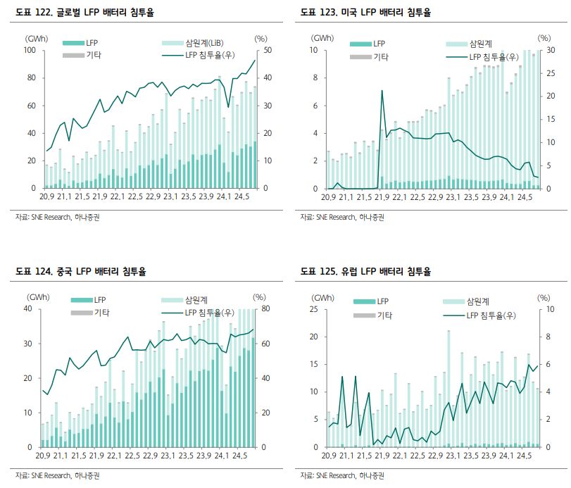'24년 8월 LFP 배터리 침투율은 글로벌 46.4%(MoM +2.5%p), 미국 2.5%(MoM -0.3%p), 중국 68.2%(MoM +2.0%p), 유럽 5.9%(MoM +0.4%p)