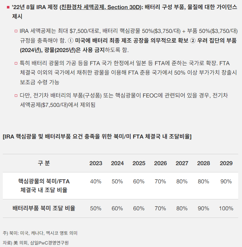 - IRA, 미국에서 재활용된 전기차 배터리 소재에는 원산지와 무관하게 자동으로 미국산으로 간주하여 보조금을 지급해주는 특혜 (링크)