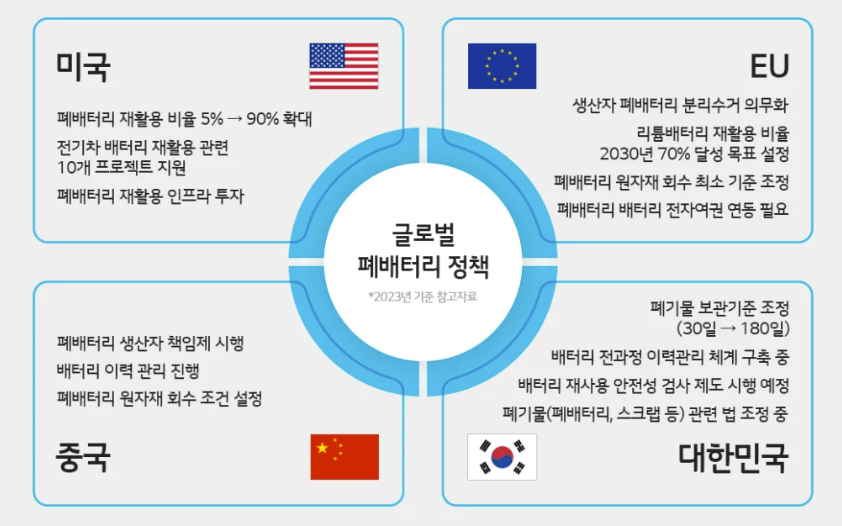 - EU 배터리법 '24년 2월 18일 시행되어 '30년부터 재활용 원재료 비율 코발트 12%, 납 85%, 리튬 4%, 니켈 4% 등으로 설정 (EU베터리법 원문)