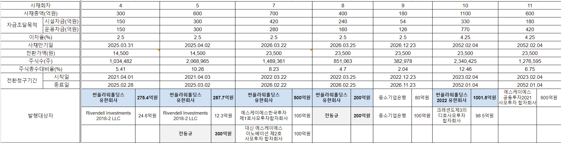 장내 매도된 풋옵션 127,035주는 7차 전환사채 발행 물량이 나온 것으로 7차 전환 사채 700억 中 대신에스케이에스이노베이션제2호사모투자합자회사와 에스케이에스한국투자제1호사모투자합자회사는 각각 425,561주 보유하였으나, 금번 장내 매도를 통해 각각 76,978주, 50,057주 매도하여 348,553주, 375,474주 보유하게 됨 -> 에스케이투자펀드 성격 상 매도 의지 높을 것으로 판단되고 매도 가능 물량 많아 오버행 이슈 지속 존재