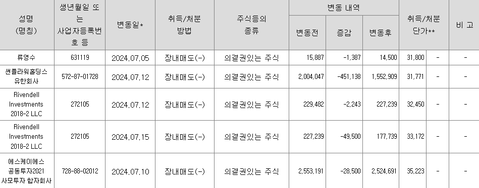24년 7월 17일 썬플라워홀딩스 보유 2,004,047주 중 451,138 장내 매도하여 1,552,909주 잔여, Rivendell Investments 229,482주 + 227,239주 中 51,743주 장내 매도하여 404,978주 잔여, 에스케이에스공동투자2021사모투자 합자회사 2,553,191주 中 28,500주 장내 매도하여 2,524,691주 잔여