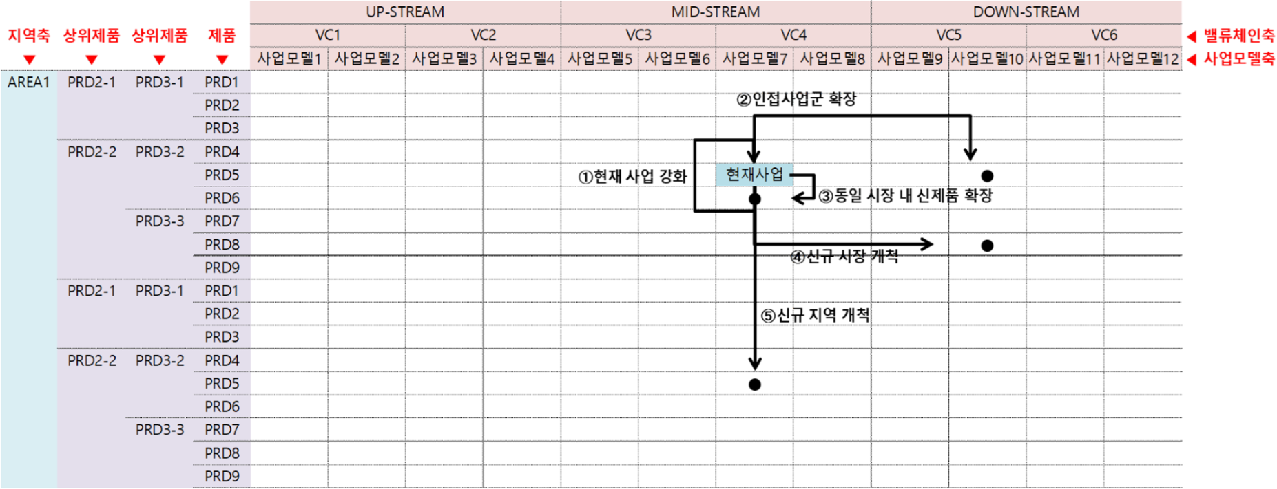 - 일반적으로 시장을 규정하는 축은 지역, 사업군, 제품군, 벨류체인 4가지