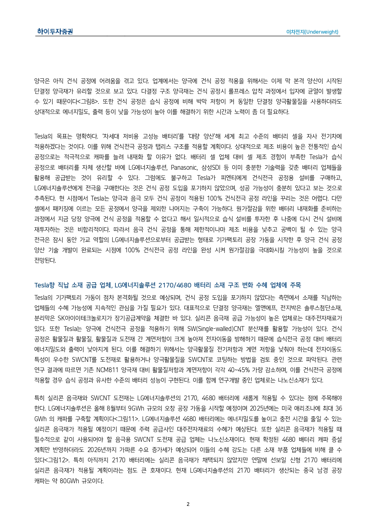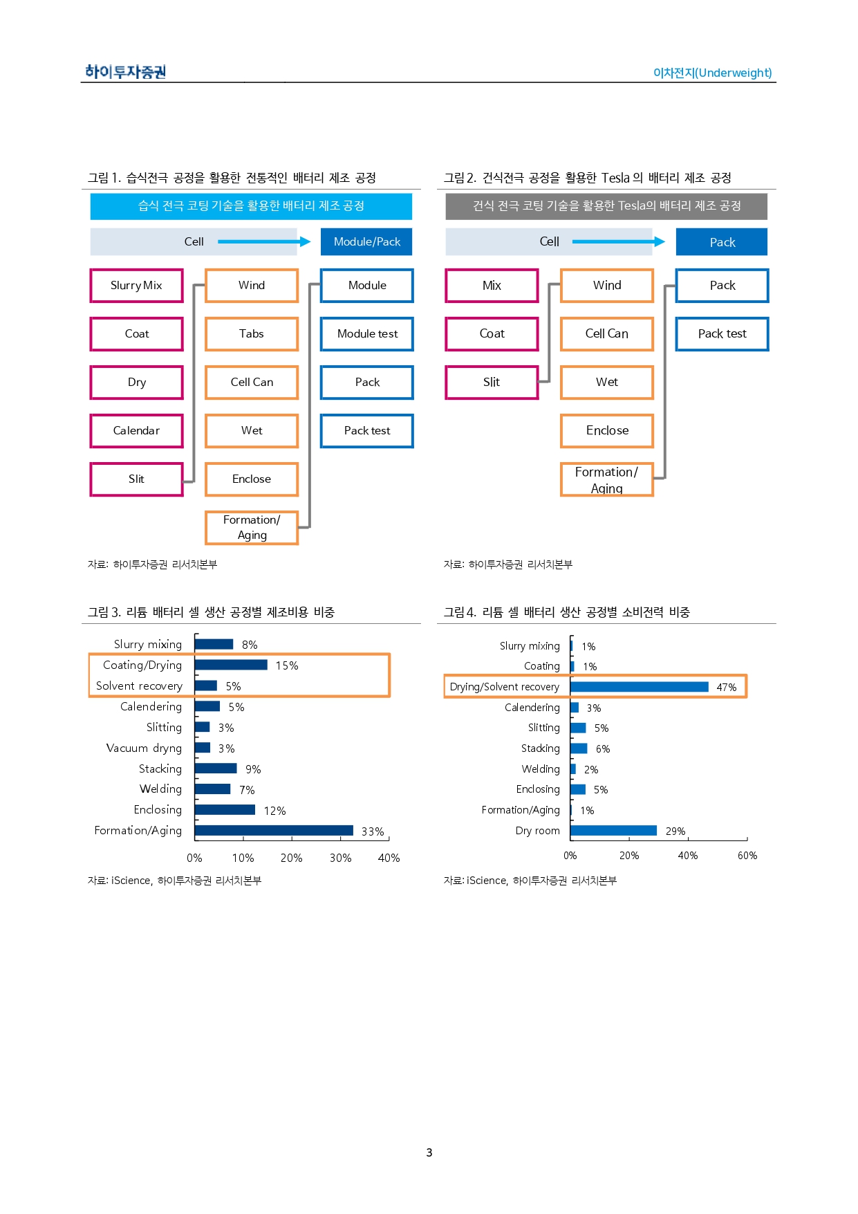 - 습식 전극 코팅 공정 內 코팅 및 용매 건조 비용 20%로 가장 높아 테슬라 자체 생산 시 건식 공정 선호도 高