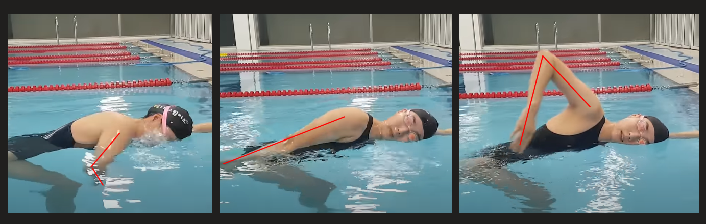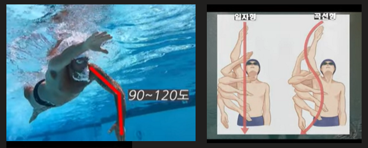 물을 잡고 밀때는 손바닥을 펴고 팔뚝과 손이 일자형태로 유지되어야함. 물은 손바닥으로만 미는게 아닌 팔뚝과 손 전체로 미는 것