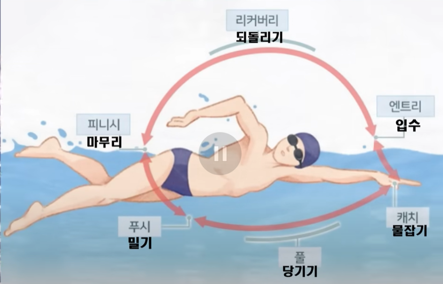 [PULL] - 물안에서 팔을 일자로 펴고 미는게 아니라 120도 가량 각도를 만들어 밀고 중간 이후에서 더욱 강하게 밀어야 몸이 가라앉지 않고 수면을 나아가는 형태가됨 - 각 손가락이 벌어질만큼 손바닥에 힘을 빼고 푸쉬 [PUSH ] 손바닥이 하늘을 볼 수 있게 딱 수면 위정도 까지 쭉 밀어줌 [RECOVERY] - 팔꿈치에 실이달려 팔꿈치만 움직인다는 느낌으로 하이엘보를 시전해야함 - 하이엘보 후 머리 앞쪽으로 슬라이딩 - 손에 힘을 빼고 슬라이딩하면 손바닥이 자연스럽게 물안으로 들어갔다가 유선형으로 나옴