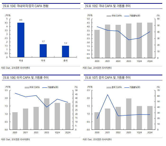 - 대형사들의 CAPA 가동률은 80% 이상으로, 급증하는 오더를 감당하지 못하는 상황. 반면, 동사는 2Q24 기준 법인별 가동률이 한국 40%, 미국 35%, 중국 27%에 불과