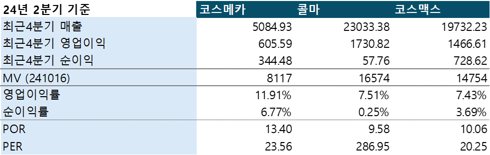 - 또한, '23년 판관비 비중 콜마 20.26%, 코스맥스 11.17%, 코스메카코리아 12.19%