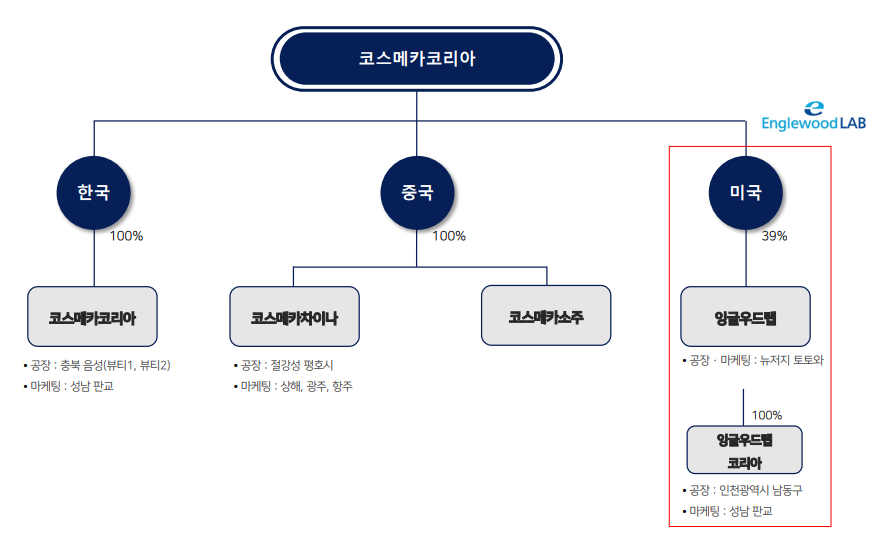 - '18년 코스메카가 '04년 설립된 잉글우드랩 지분 34% 인수 후 현재 코스메카 보유 지분 44%