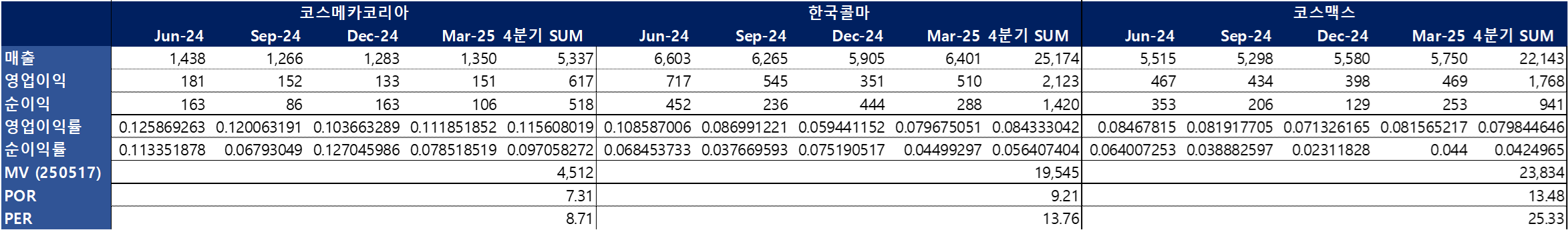 - 반면 코스메카는 25년 예상 매출 5580억 영업이익 680억 순수익 580억 수준으로 매출 6배 가량 차이 나나 순수익은 3배차이에 그침 (24년 매출 5,240억 영업이익 600 억 순이익 540억)
