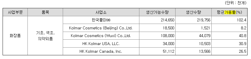- 한국콜마와 코스맥스 가동율은 국내는 여유없으나, 미국 법인은 여유로움