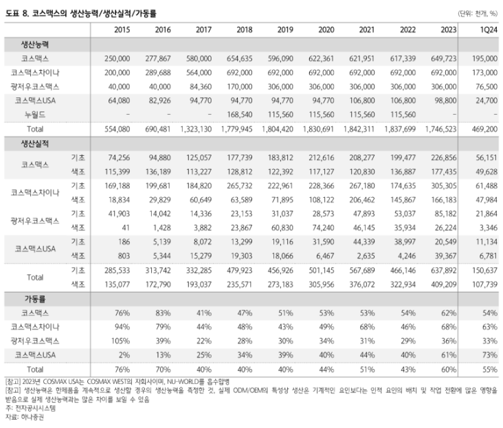 - '24년 1분기 코스맥스 가동률 54%, 미국 법인 73%