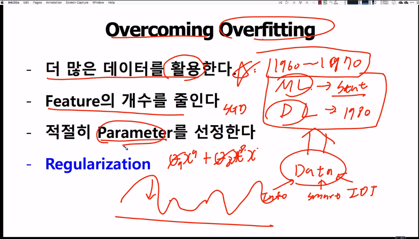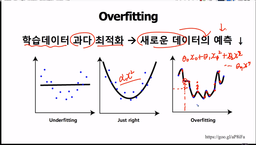 ・Overfitting된 경우, train데이터 과도하게 피팅되어 training값 이외의 feature값을 넣었을 때는 예측하기 어려워진다.