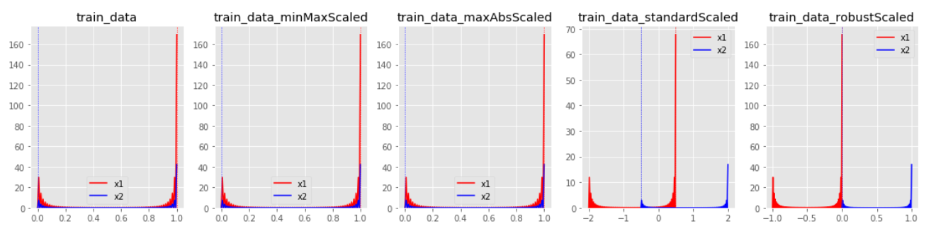 from sklearn.preprocessing import MaxAbsScaler maxAbsScaler = MaxAbsScaler() print(maxAbsScaler.fit(train_data)) train_data_maxAbsScaled = maxAbsScaler.transform(train_data)