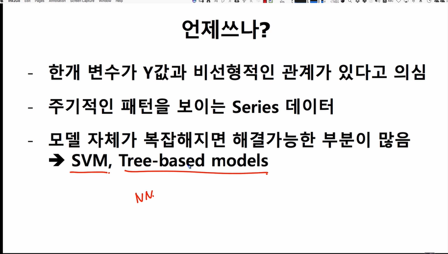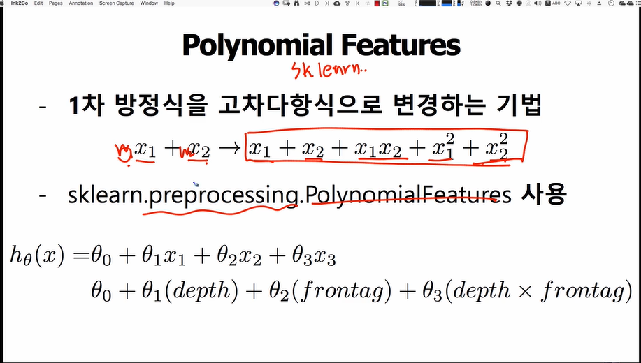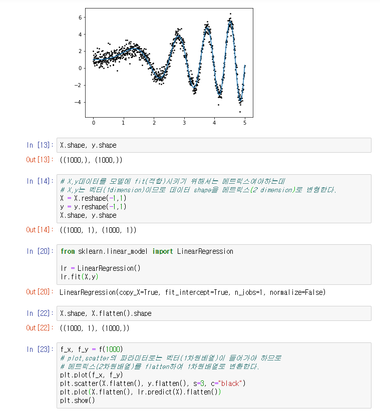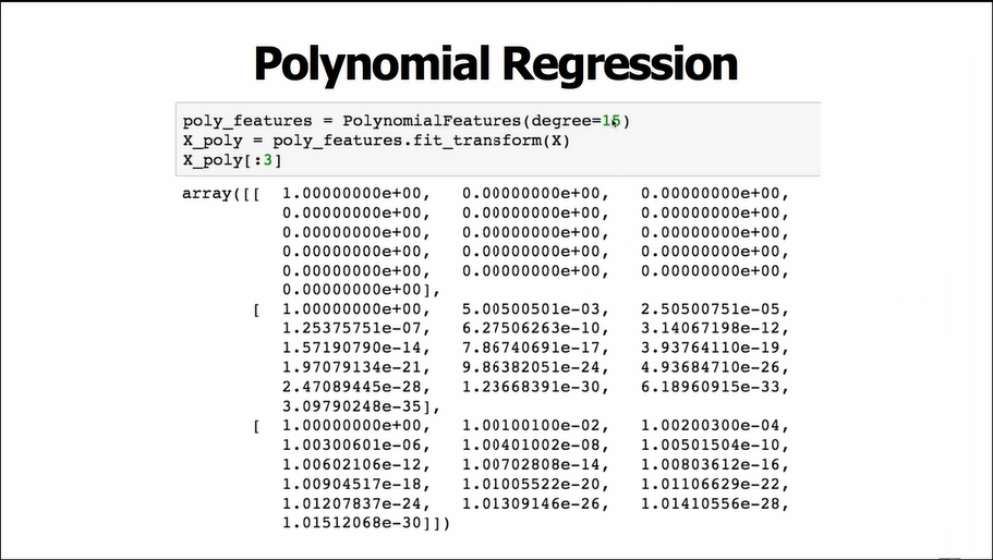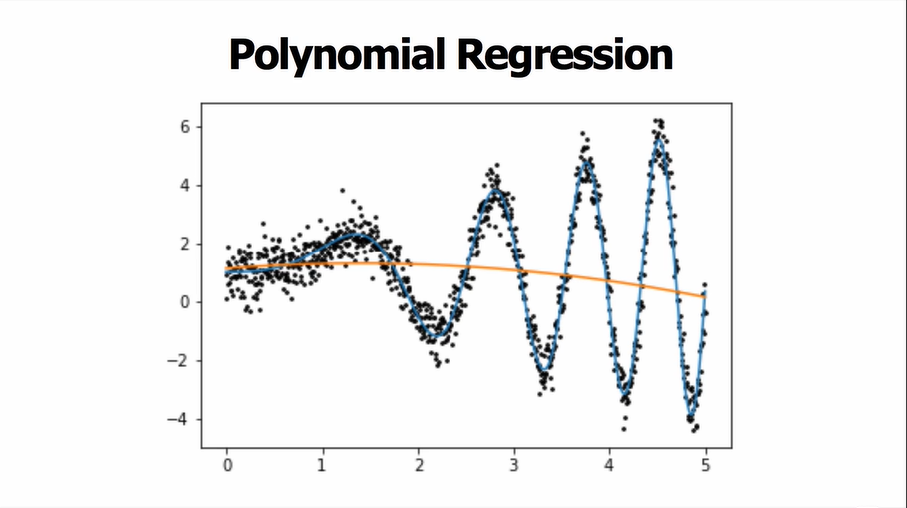 ・polynomial regression : 단순 선형방정식을 비선형방정식(선으로된 그래프가 아니라 막 굴곡있는 그래프)으로 변형하여 모델링을 더 적합하게 하는 기법
