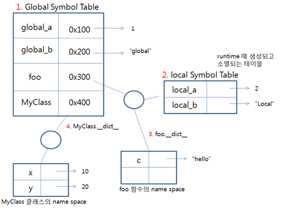반면, 내장 함수는 심볼 테이블이 존재하지 않으며, 내장 클래스의 객체( str, tuple, dict 등 )는 심볼 테이블이 존재하지만 확장이 불가능합니다.