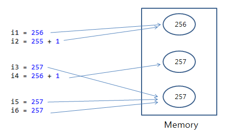 그런데 257 이상의 정수가 연산으로 얻어진 결과라면 다른 객체를 가르킵니다. ( 스택 오버 플로우 - 링크 )