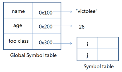 예를들어 위 그림에서 전역으로 할당된 name, age , foo class 변수가 저장되어 있는 table을 Global Symbol table( 전역 심볼 테이블 )이라 하고,