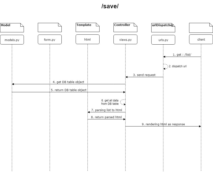 7. parsing list to html, 8. return parsed html, 9. rendering html as response