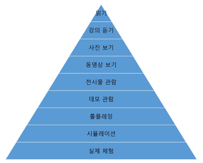 경험의 뿔 : 높은 곳에 있는 경험의 종류일 수록 망각률이 높고, 낮은 곳에 있는 경험의 종류일 수록 망각률이 낮다. 즉, 낮은 곳의 있는 경험을 할 수록 쉽게 잊지 않는다. 경험의 뿔, 플레이의 가치를 말하다