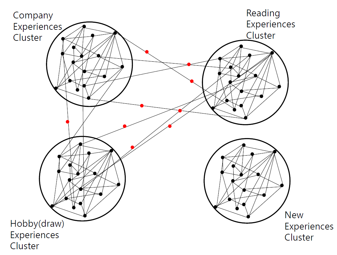 위 그림은 각 경험이 어떻게 상호 작용하는지를 시각화한 그림이다. (어디까지나 개인적인 가설이다!) 검은점은 경험에 의한 창조된 생각이다. 각 생각은 어떠한 연관성에 의해 서로 연결되어 있다. 각각의 생각은 그 생각이 창조된 환경에 맞추어 특정 범주에 속한다. 예를 들어, 회사에서 쌓은 경험은 회사경험이라는 울타리 안에 속하며, 그림 그리기라는 취미생활을 통해 획득한 경험은 취미 울타리 안에 속하고, 책을 읽음으로써 획득한 경험은 독서 울타리 안에 속한다. 이때 각 울타리를 클러스터라고 부르기로 한다.