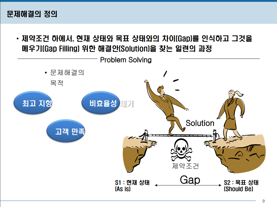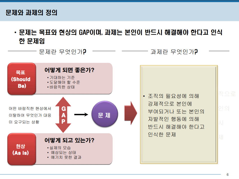 목표와 현재 상태의 GAP이다. 따라서, 문제를 인식하기 위해서는 목표와 현재상태를 인식할 수 있어야 한다.-